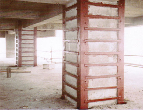 混凝土外包型鋼加固法也是一種使用面較廣的傳統(tǒng)加固諒,分濕式與干式兩種情況。兩者相比,干式外包鋼施工更為簡便,但承載力提高量、整體工作性能及受力特點(diǎn)也不如濕式外包鋼有效。濕式外包鋼加固施工較為復(fù)雜。但濕式外包型鋼加固技術(shù)與粘鋼加固技術(shù)結(jié)合起來,用新型結(jié)構(gòu)膠代替乳膠水泥和環(huán)氧化學(xué)灌漿,給施工帶來較大方便,且型鋼能與原混凝土結(jié)構(gòu)共同受力,同時(shí)發(fā)揮了外包型鋼加固技術(shù)與粘鋼加固技術(shù)的優(yōu)點(diǎn)。
